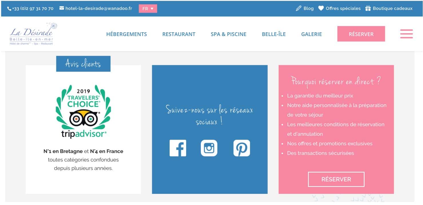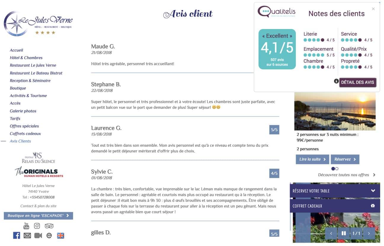 Sous forme d’extrait sur différentes pages du site (ex : un bon commentaire orienté qualité de la cuisine dans la partie Restaurant / un autre sur les soins pratiqués dans